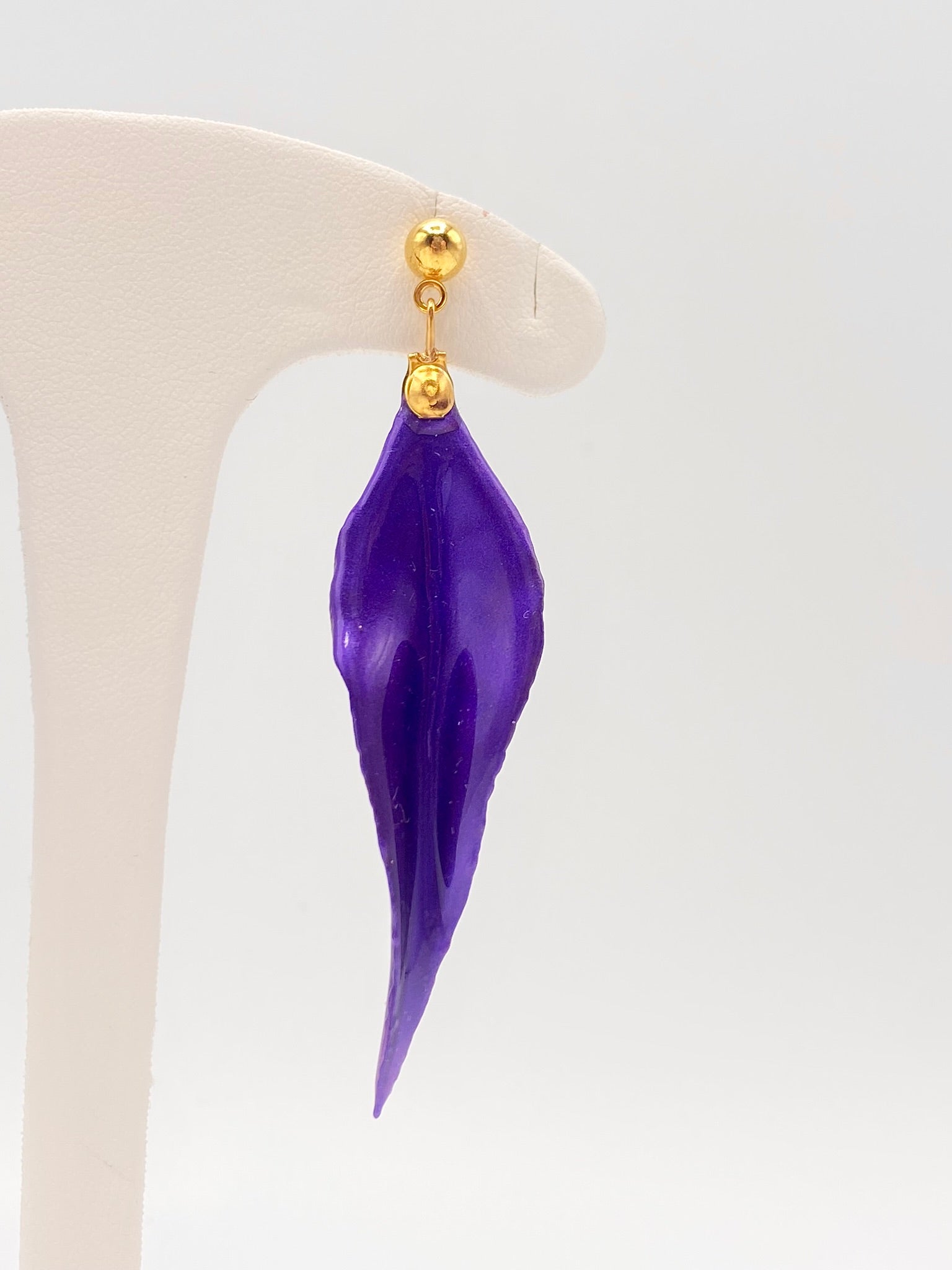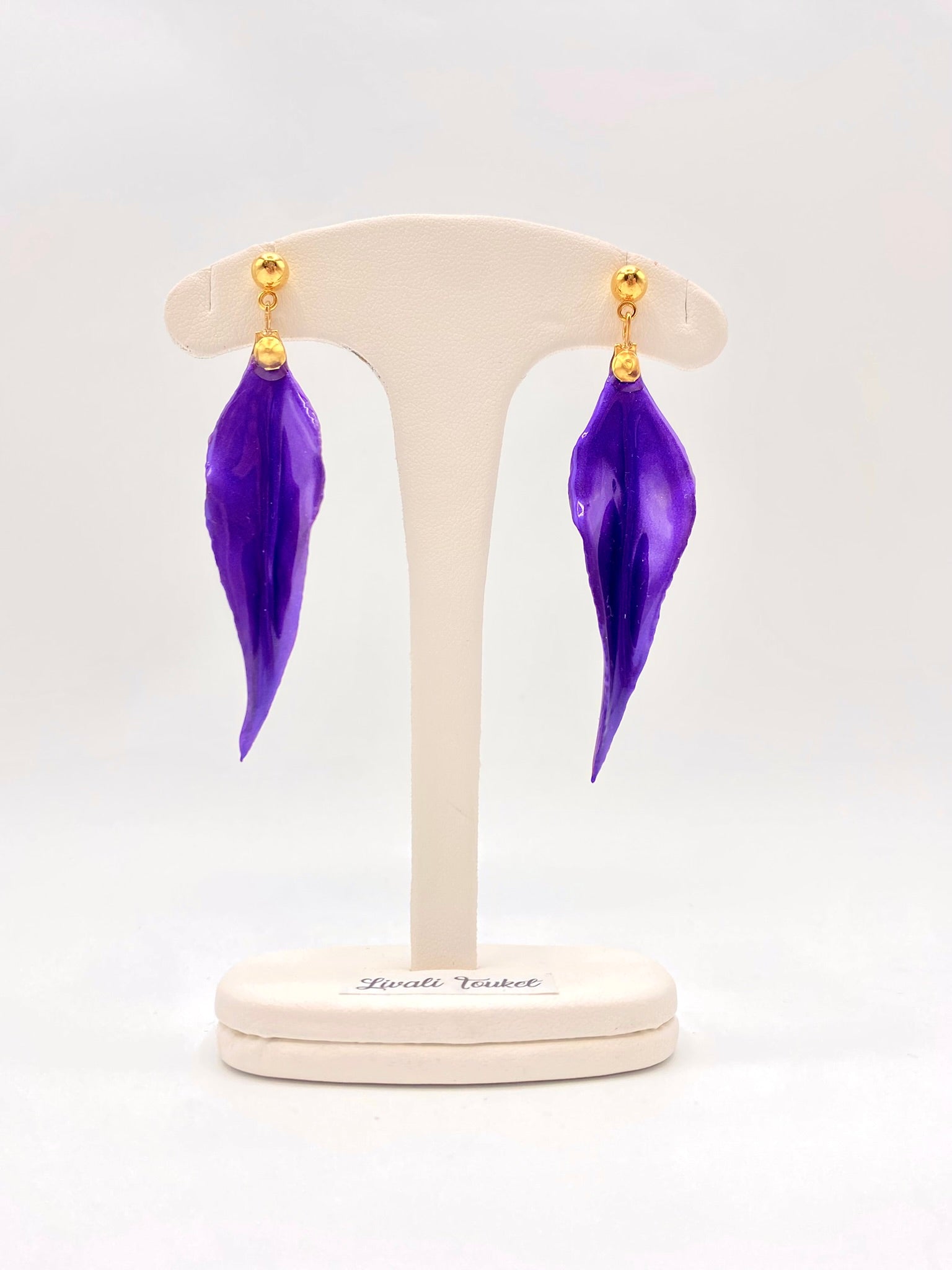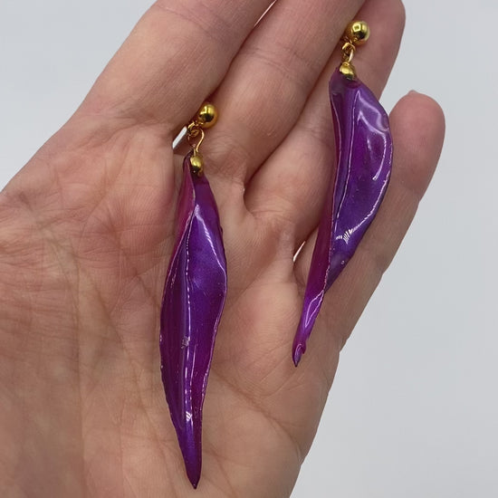 Pendientes naturales en forma de hoja, en color morado metalizado hechos a mano.