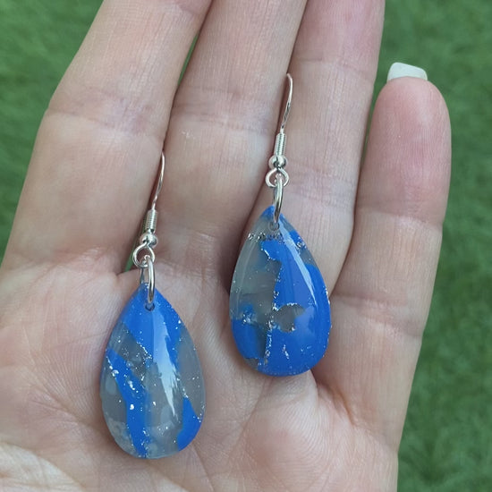 Pendientes con forma de gota, realizados en arcilla azul y translúcida, con toques de pan de plata, dándole así un aspecto marmolado que da origen a que cada pieza tenga un dibujo diferente y muy especial, cada una es única, intentamos de esta manera imitar el proceso natural del mármol.