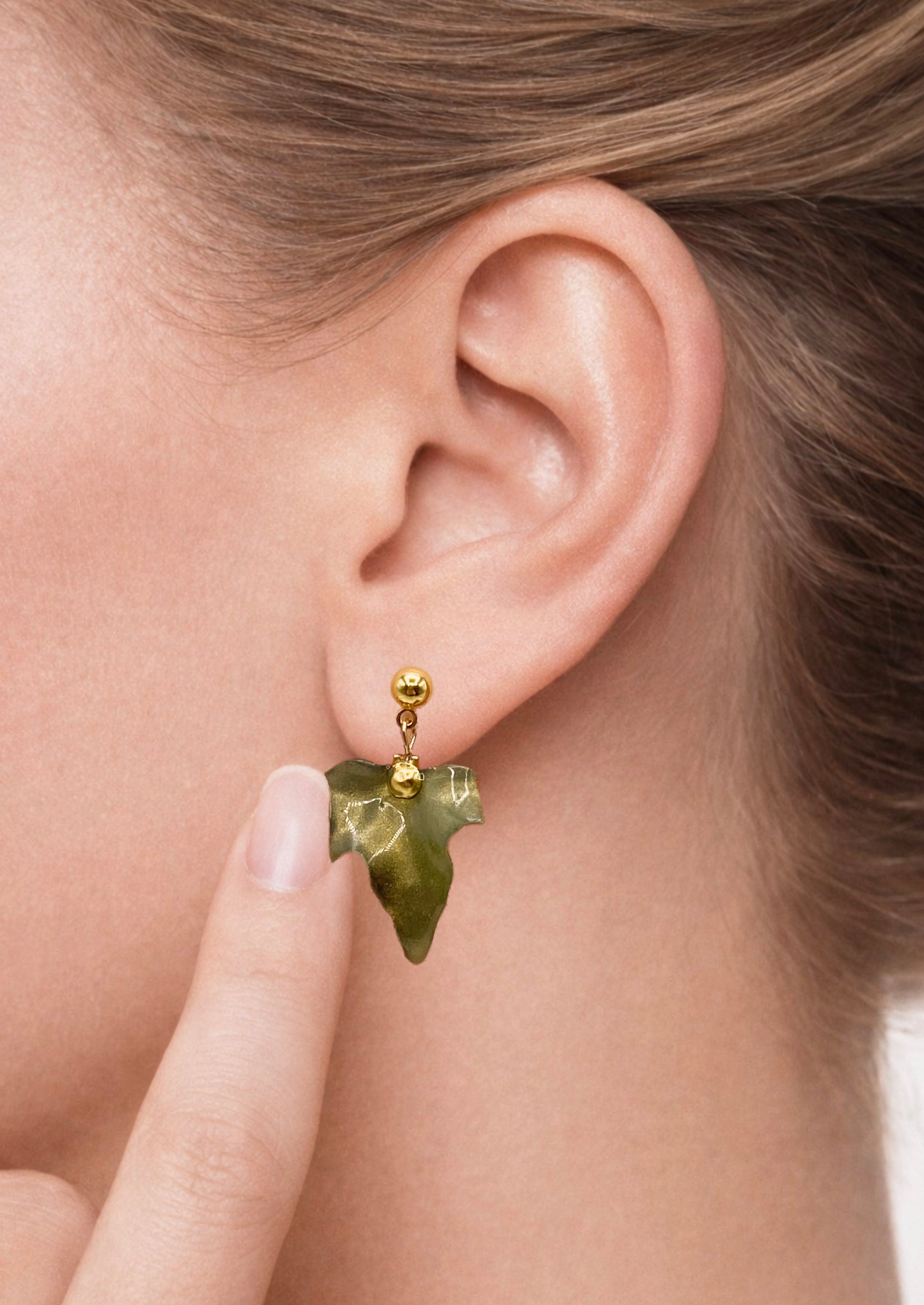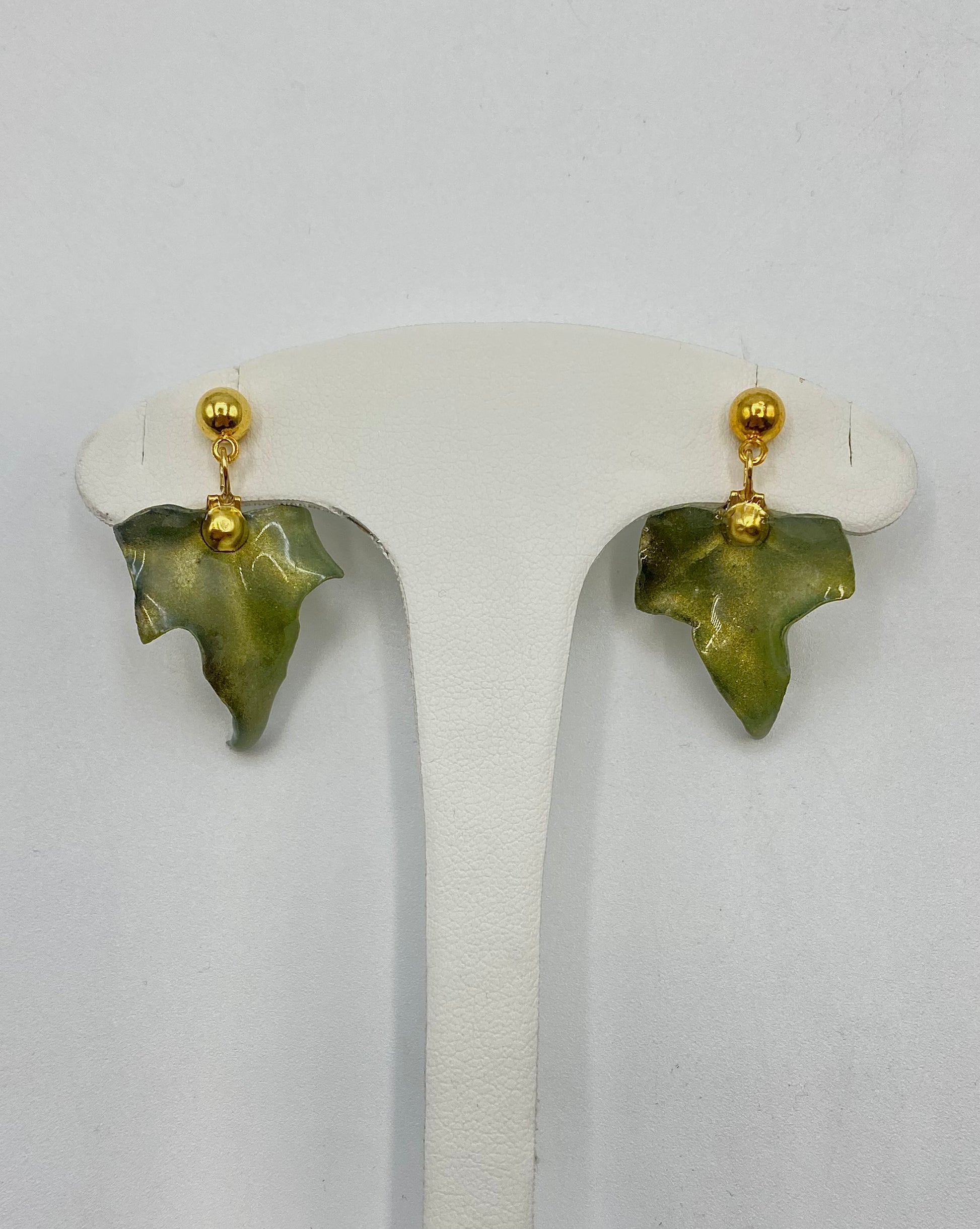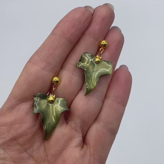 Pendientes naturales en forma de hoja, pequeña y ancha en color verde metalizado hechos a mano.
