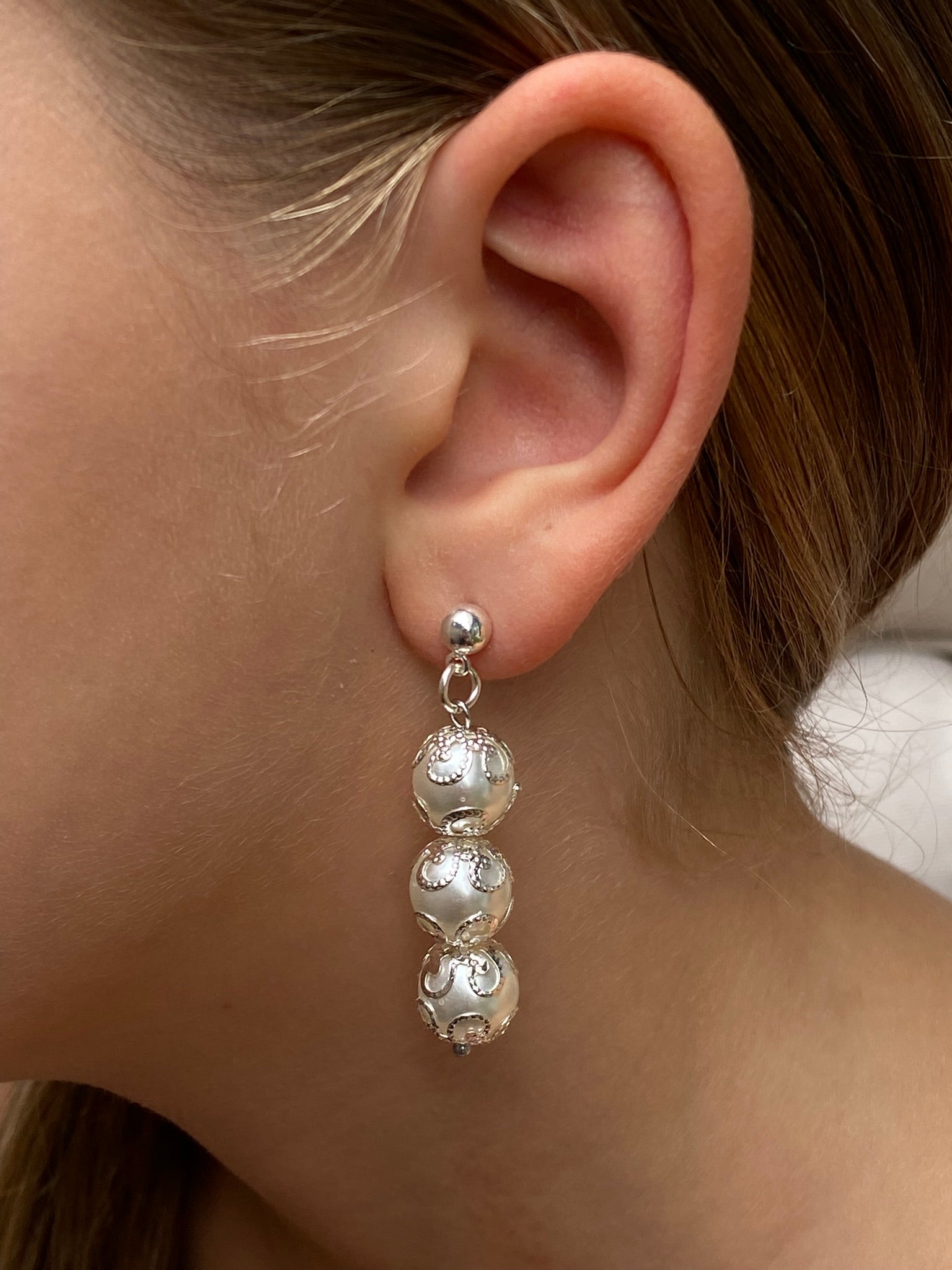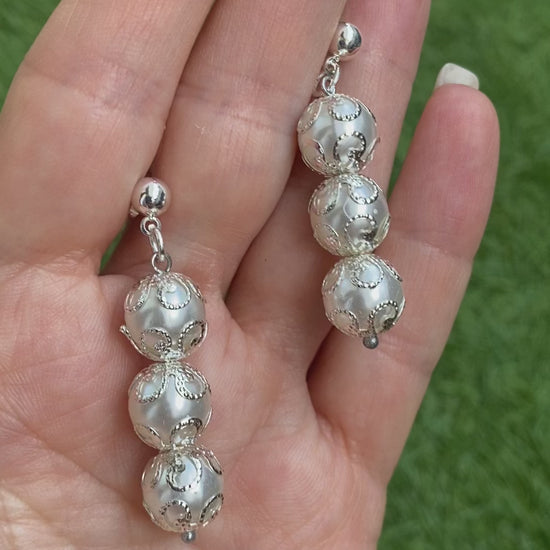 Pendientes largos realizados tres perlas de 10 mm en blanco y engarces de filigrana plateada, queriendo darle así un aspecto más sencillo y limpio propio de la elegancia de las perlas.